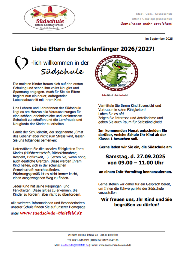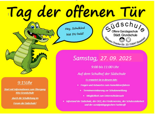 dem 27.09.25 in der Zeit von 09:00-11:00 Uhr, zum „Tag der offenen Tür“ an die Südschule ein.
